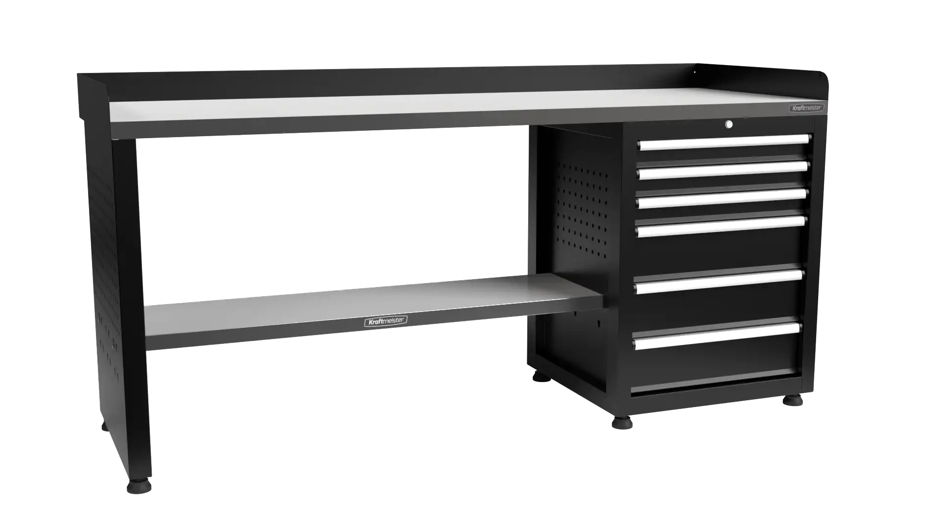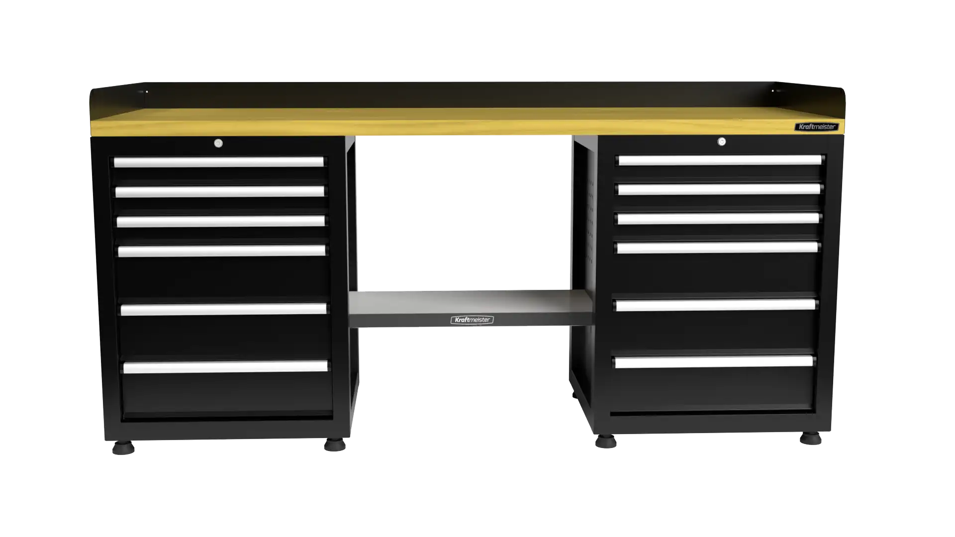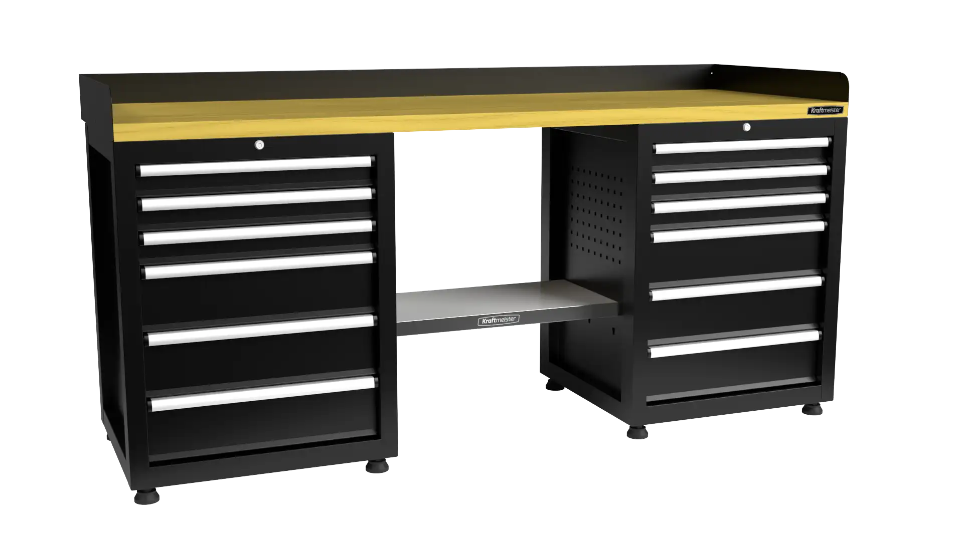 All drawers of the Pro workbench are fitted with ball-bearing drawer slides and have an impressive load capacity of 60 kg per drawer. This means you can safely store all your heavy tools and materials without worry. The drawers slide smoothly and quietly, giving you easy access to everything you need.