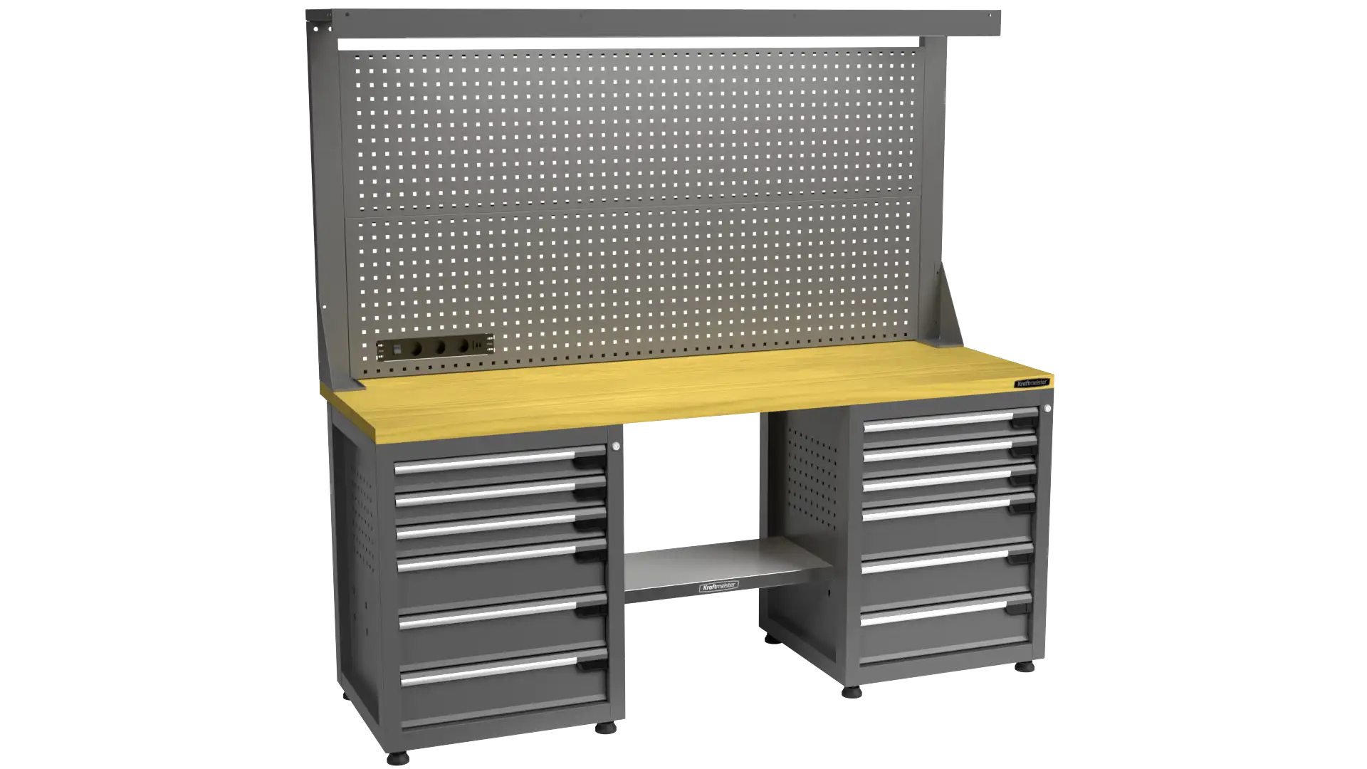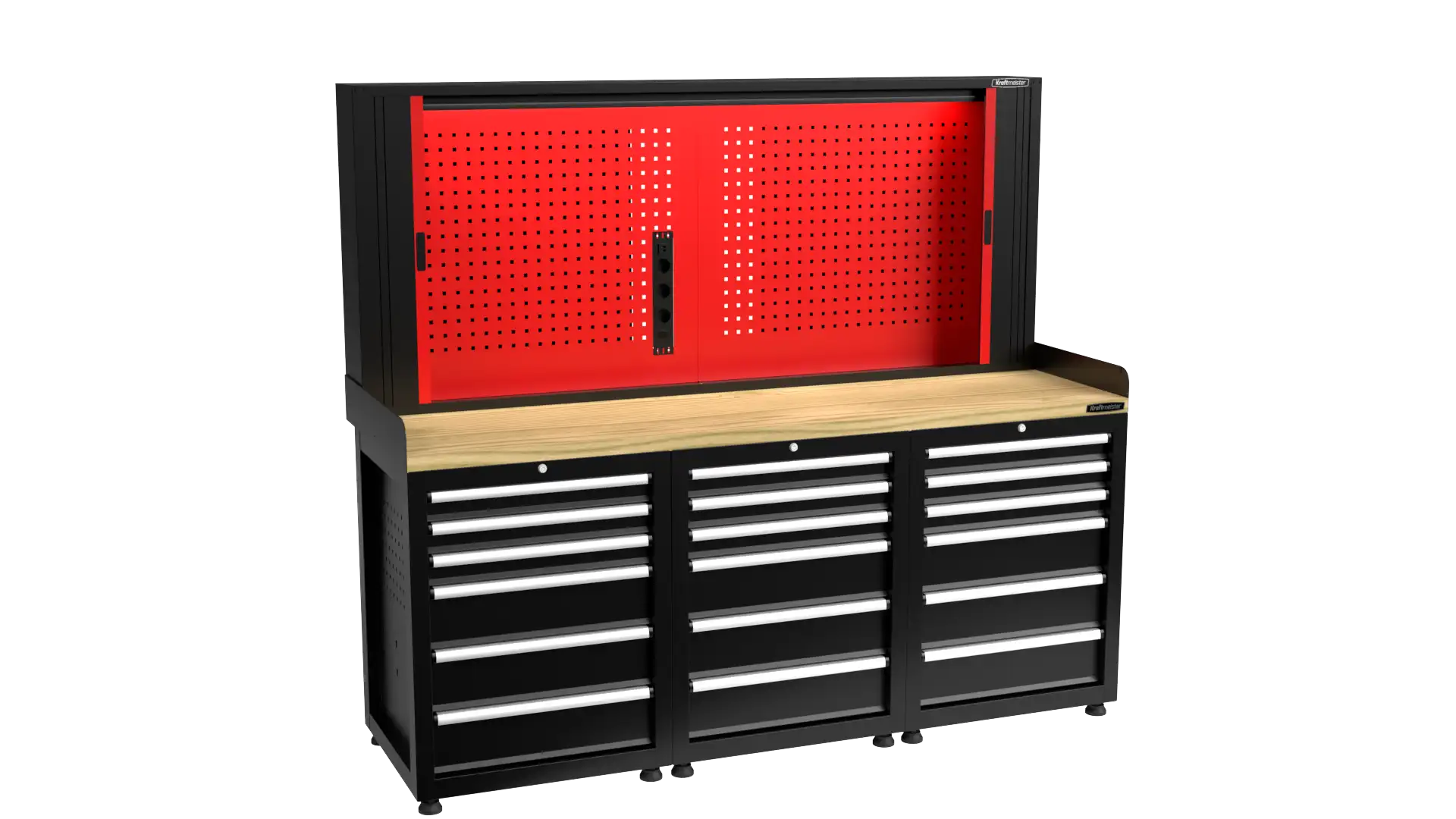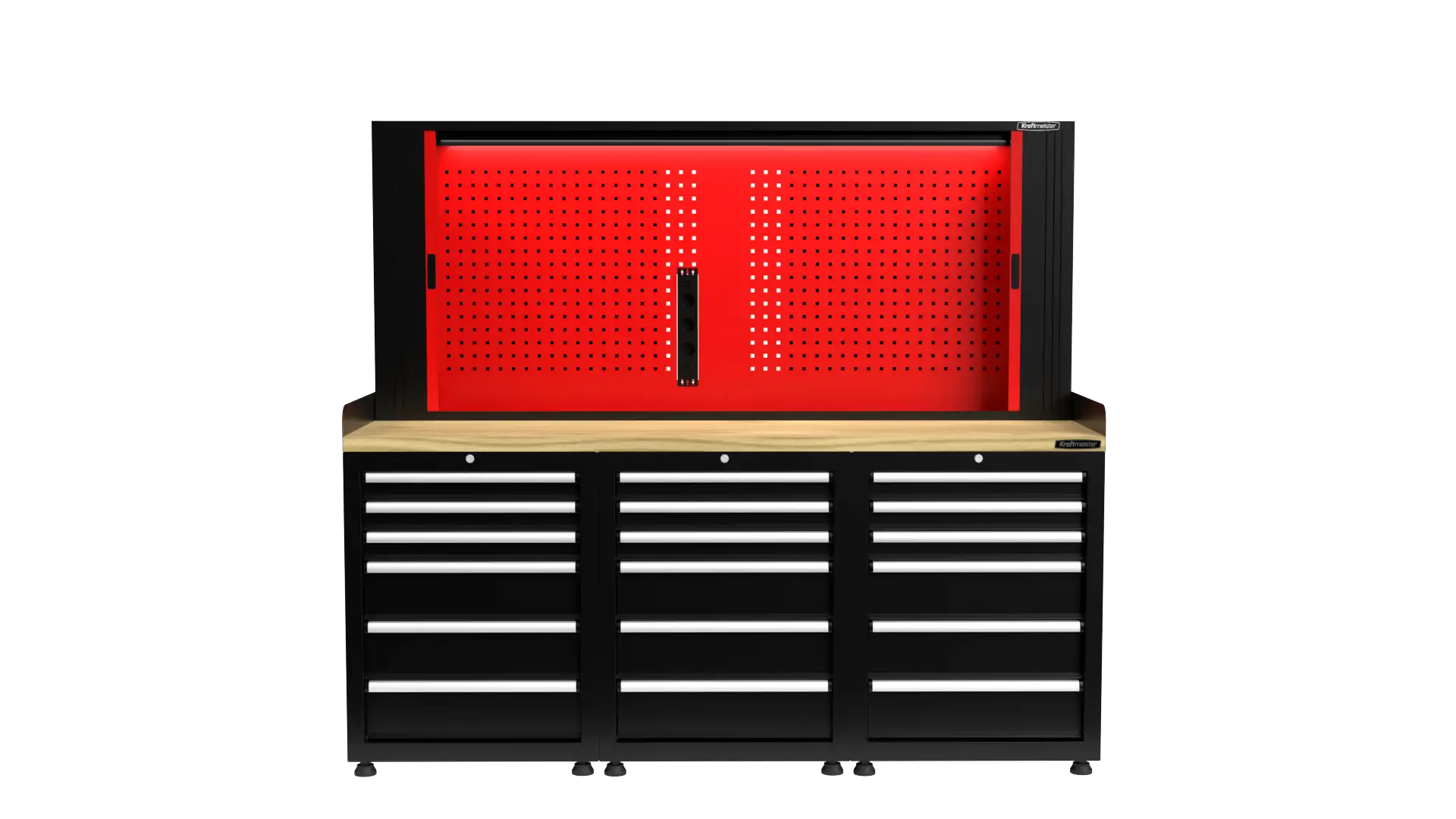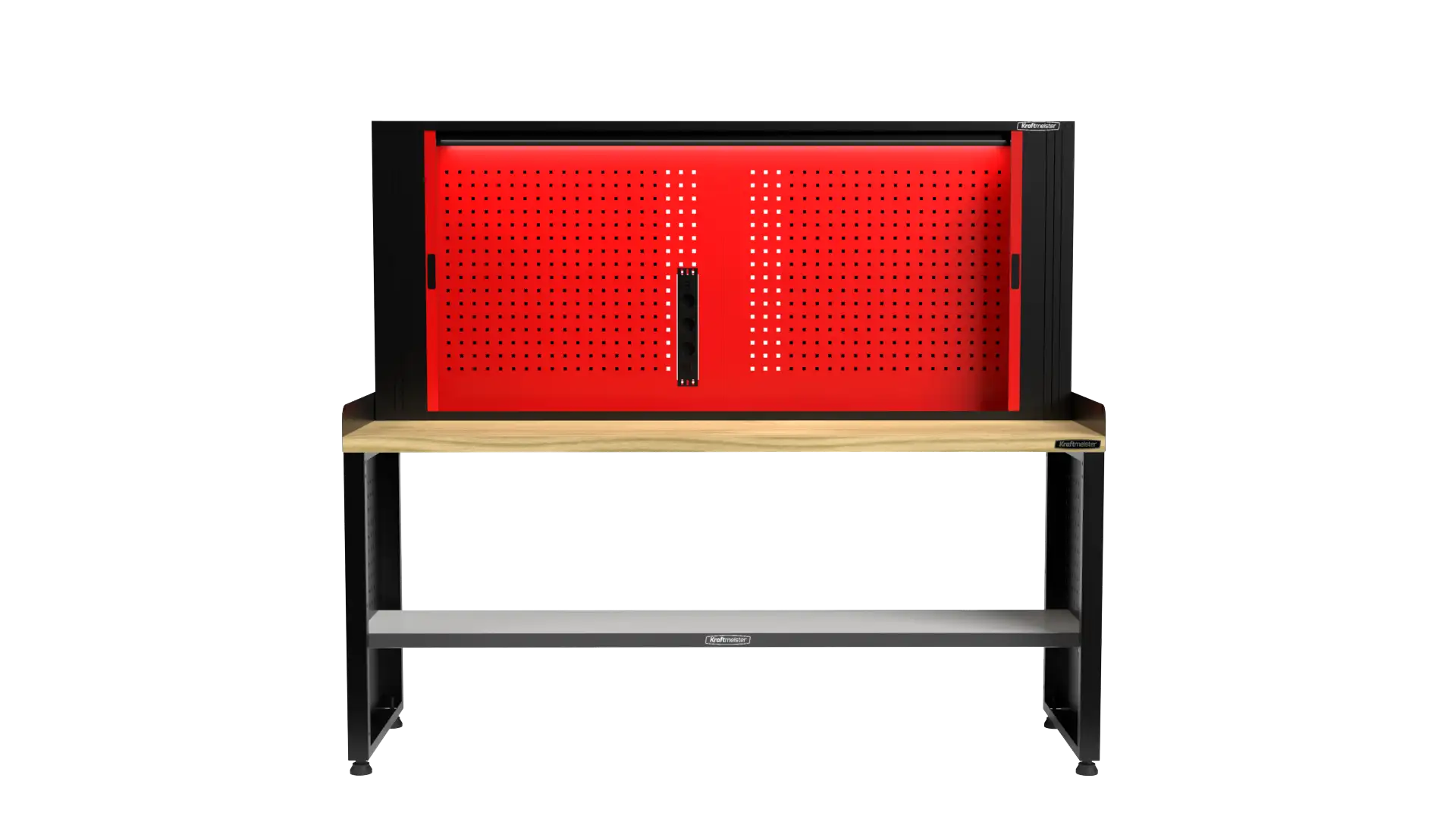The Pro workbench can be expanded with an optional perforated tool panel. This panel is equipped with LED lighting, ensuring you always have a clear view of your work. Additionally, an integrated outlet allows you to connect all your electric tools directly.